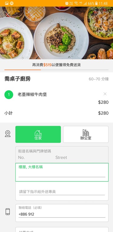 確定餐點後就可以開始結帳了,上面有說明再消費519元就可以免費送貨,但這次只有我一個人吃,所以就直接付運費了。