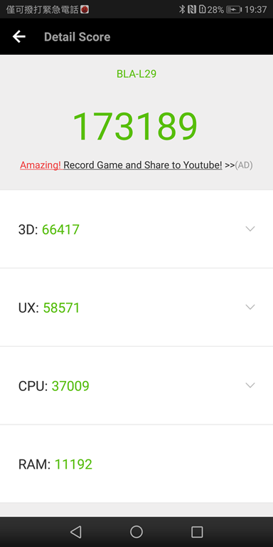 跑分部分以安兔兔進行測試,得到與目前其他旗艦機種差異不大的高分,顯示 Huawei 處理器與其他品牌頂級處理器平起平坐。