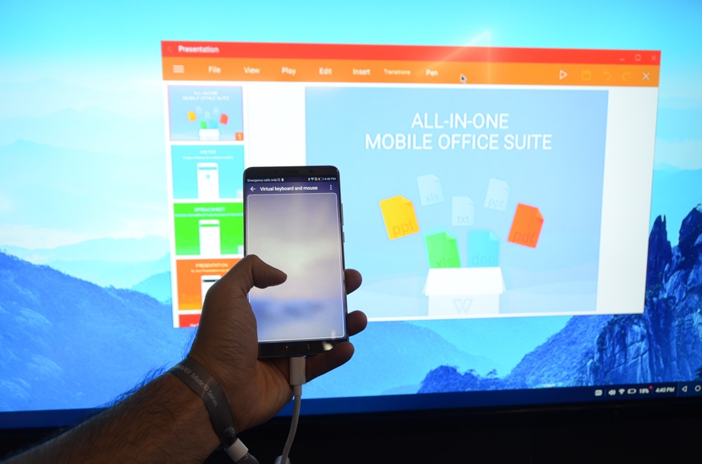 雖然這功能乍看與 Samsung DeX 非常相近,但在設計上有些不一樣,Huawei Mate 10 的手機投屏功能不需要有基座,只要有一般 Type C 的 HDMI 轉接線,就可以將畫面以桌面模式投影在螢幕上,但手機並不需要先行連接藍牙滑鼠或鍵盤,直接可以做為滑鼠觸控板與鍵盤來輸入。