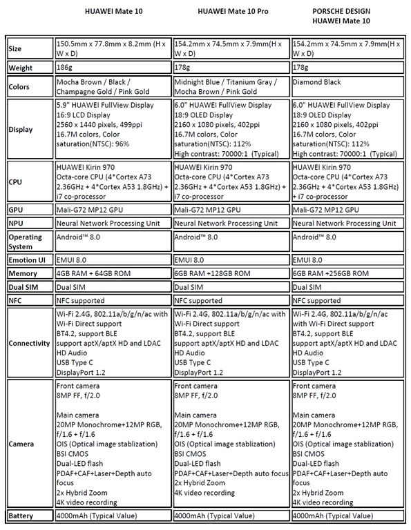其他規格部分整理如下,其中包含 Mate 10、 Mate 10 Pro 與 Porsche Design,分享給大家參考。