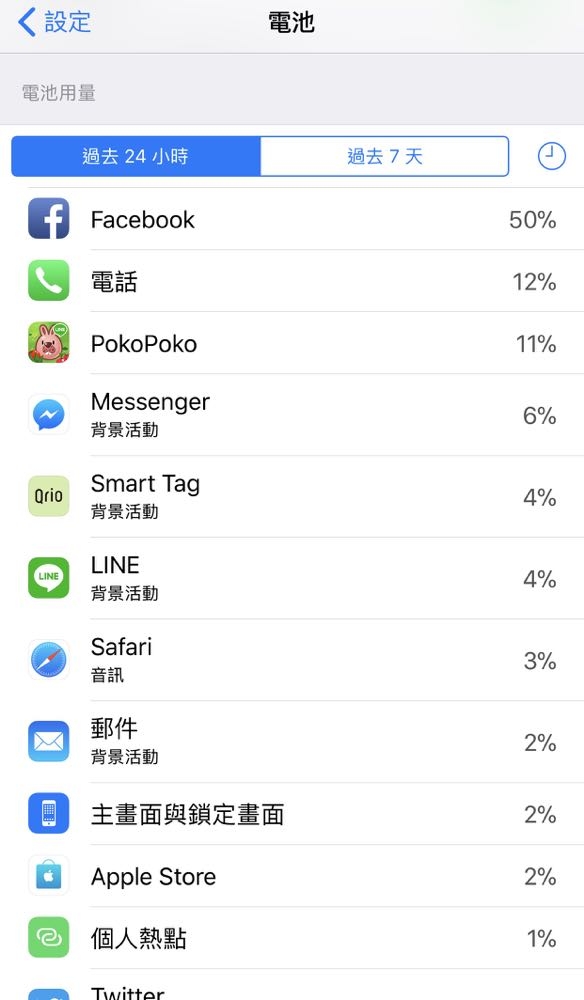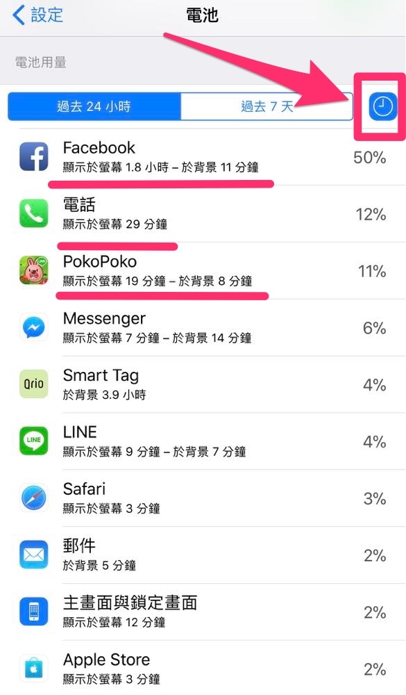 其中還分為「過去 24 小時」「過去 7 天」兩種選擇,點下旁邊的時鐘符號,會進一步的在每個應用程式下方出現使用的時間與在背景的時間。