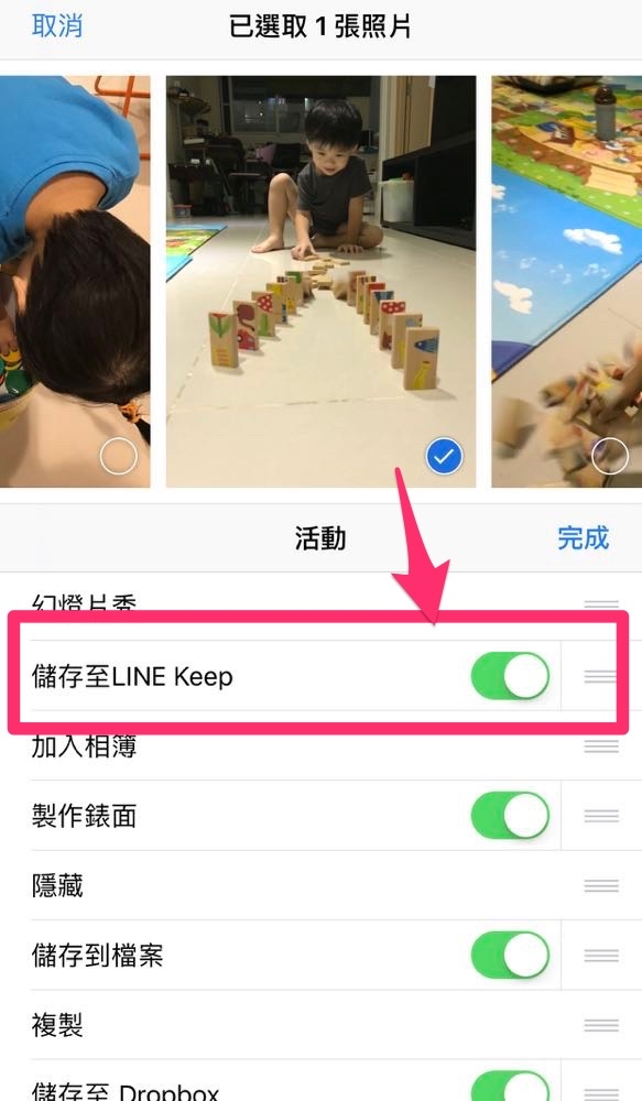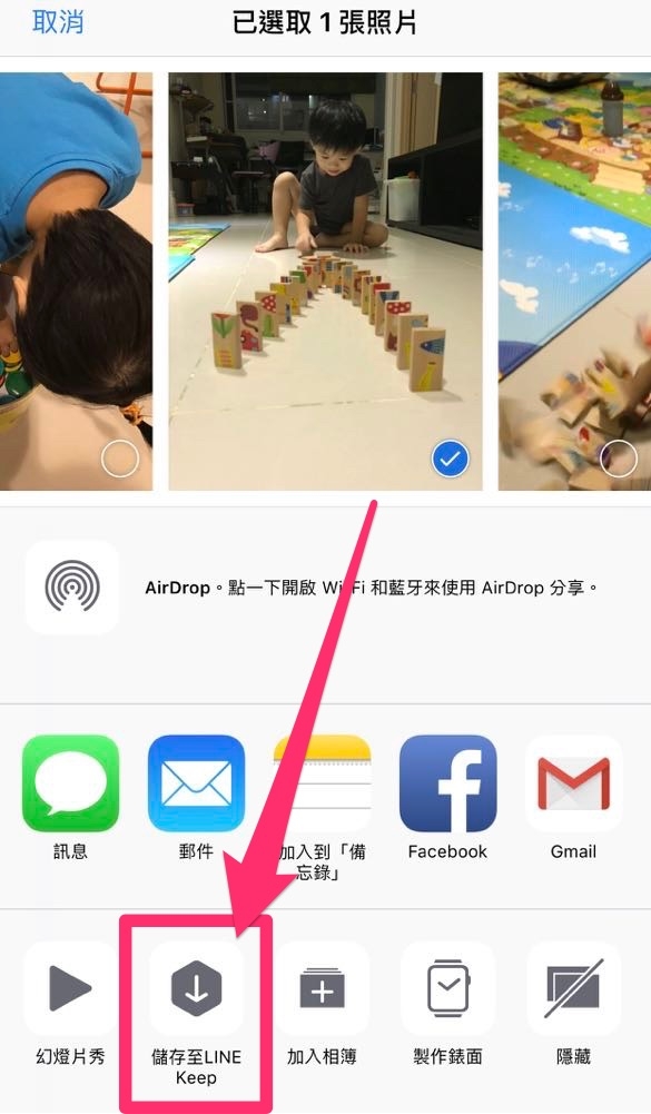 當我們在 Live Photo 上拍好與選擇想要的風格後,就可以從下方「分享」來選擇「儲存到 LINE Keep」。