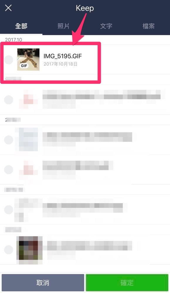 接著在 LINE 中我們可以從聯絡人的對話視窗中,點選跟相片、語音、位置資訊等一樣位於下方的「Keep」。我們就能看到剛剛的 Live Photo 動態照片已經存成 GIF 檔位於其中。