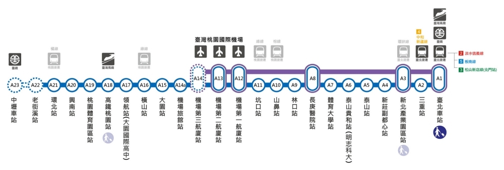 停靠站A1台北車站、A3新北產業園區站、A8長庚醫院站、A12機場第一航廈站、A13機場第二航廈站