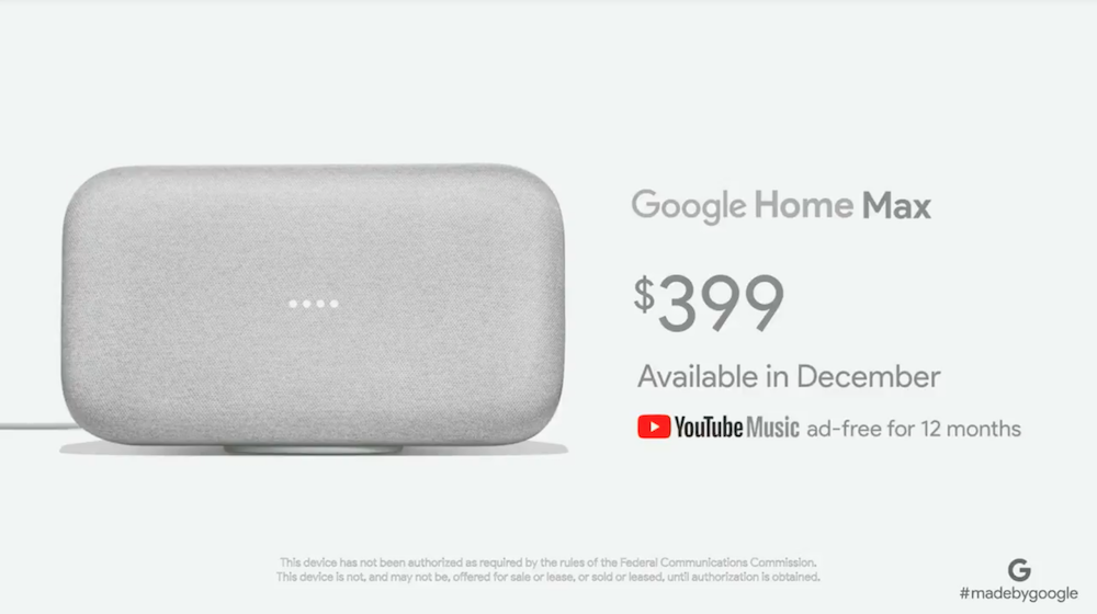 Home Max 預計在今年的 11 月 13 日開放預購,12 月就會正式在美國、英國、法國、加拿大、澳洲、日本等國家上市,建議售價為 399 美元,折合台幣約為 NT$12,200 元,購買的消費者,將免費獲得 YouTube Music 一年免費聽的優惠。