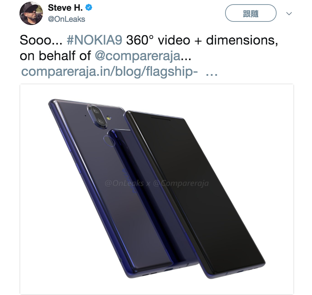 根據爆料大神 @OnLeaks 在個人 Twitter 上的貼文指出,Nokia 9 的 360 度渲染圖已在稍早悄悄曝光,從圖片中可以清楚看到,Nokia 9 預計會搭載目前智慧型手機主流的全螢幕設計,螢幕尺寸預計會在 5.5 吋至 6 吋之間,並有可能搭載高通 Snapdragon 835 處理器、4GB RAM/64 or 128 GB ROM。此外,渲染圖中也可清楚看到,Nokia 9 將配備雙主鏡頭設計,極有可能採用與 Nokia 8 相同的雙蔡司鏡頭,預計將帶來出色的拍攝體驗。