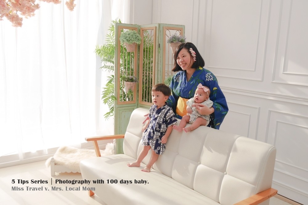 想要特別一點的話可以加入代表家庭的元素,像我們婚前就很喜歡去日本,拍過一系列的振袖婚紗照,大小寶也都在肚子裡跟我們訪日過,所以夏日浴衣系列就是我這次設定的特別主題,浴衣都是平常訪日蒐集來的(Uq+Akachan),頭飾是之前婚紗照的配件,居然可以用到兩次拍攝我自己都覺得好划算啊(歐巴桑笑),很建議大家可以找找跟自己家庭有連結性的元素,或是延續婚禮主題等都是很不錯的方向,未來將這些照片在家中一字排開,不突兀之外也會有回憶滿屋的感覺喔!
