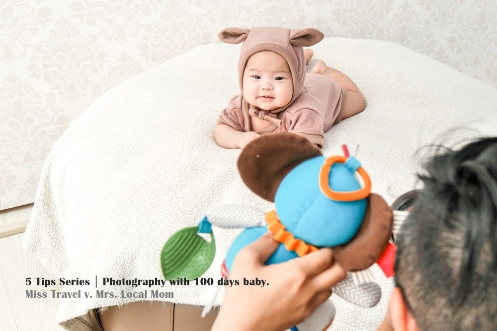 百日寶寶的視力已經從模糊發展到清晰,所以反而會開始認人跟認環境,雖然小詩琦的寶寶安撫師很專業,也有很多可以吸引小孩的家私,但一開始在兔寶身上沒辦法馬上發揮作用,所以拍了一系列奧嘟嘟臭臉照,好在我有準備平常她很喜歡的大象跟小羊玩具,果然成功吸引她看鏡頭,而且等玩開了之後安撫師隨便逗她都會笑,拍到好照片的機率就大幅提升了,所以平常可以讓小人安心的物品,什麼毯毯還是兔兔的都建議都帶著比較好。