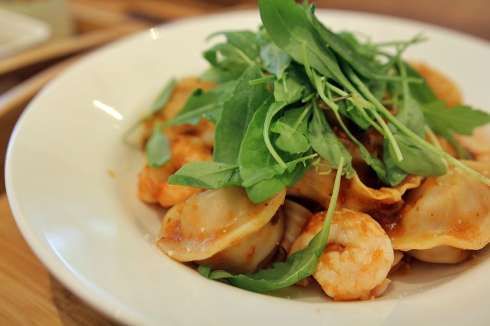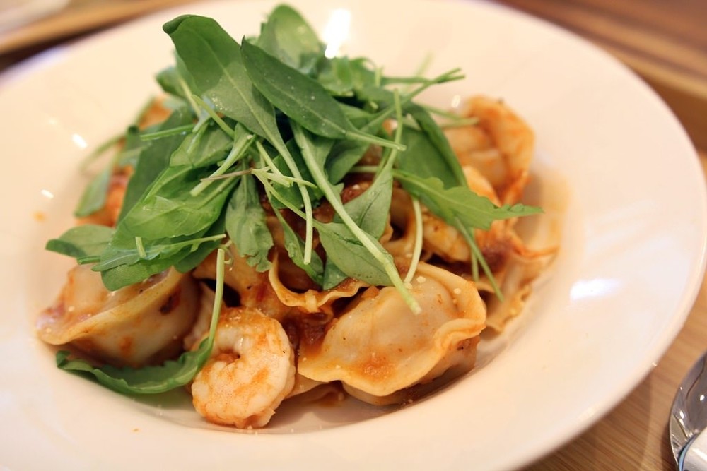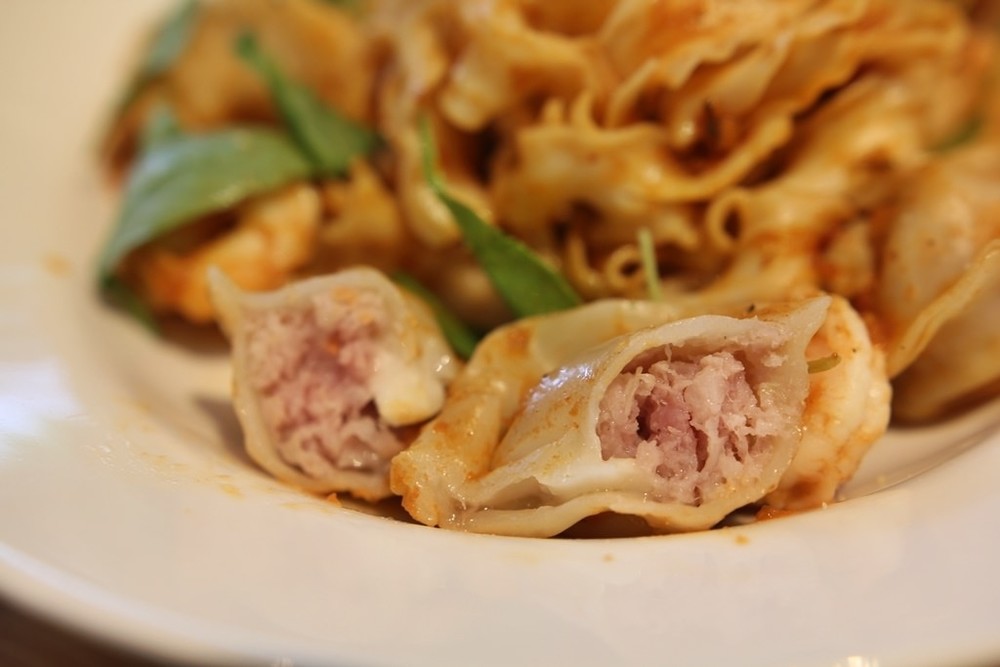 義式蝦餃搭配紅醬寬麵,兩種麵食口感交錯