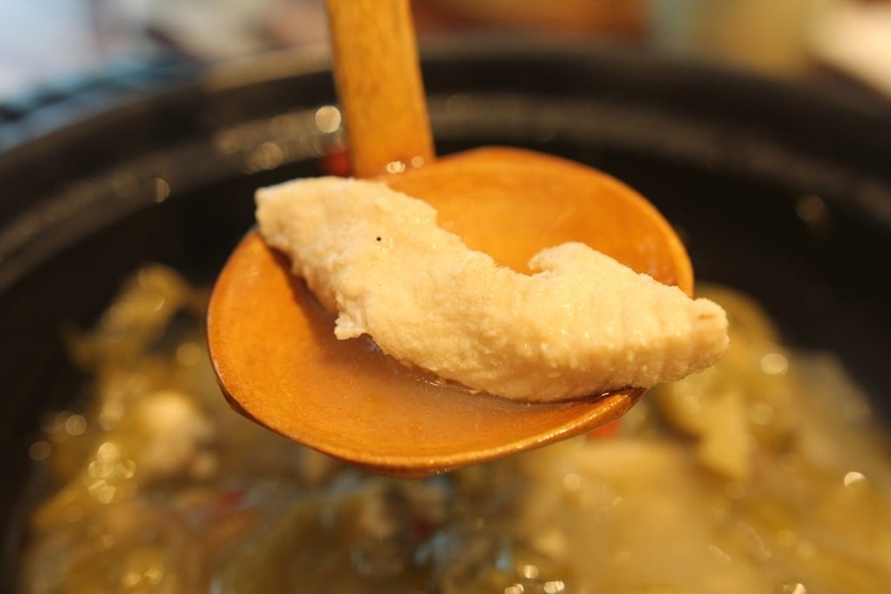 炒香花椒、薑、辣椒及自然發酵的酸菜,加入蛤蠣熬煮的湯底