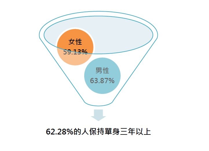 單身社會的各種數據,有利於人們客觀認識這個現象。根據某社交網站的調查報告,62.28%的單身受訪者已保持單身三年以上,而且男性和女性的比例都相當高,分別達到63.87%和59.13%。