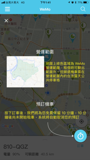 - 於 WeMo APP上按下「租車」按鈕,正式開始租借