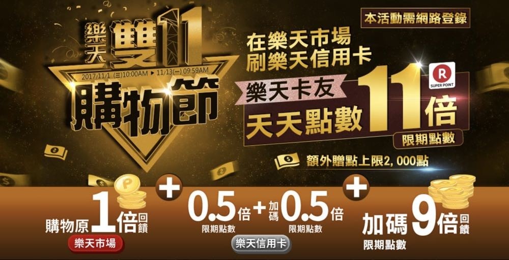 。樂天市場為回饋會員,將自 11 月 1 日上午 10 時起至 11 月 13 日上午 9 時 59 分止推出「雙 11 購物節」超優惠檔期,祭出近百件夯品整點特賣下殺 5 折、單筆滿 888 元折 111 元、滿 8,888 元折 1,111 元;使用樂天信用卡消費,天天 11 倍點數回饋,APP 購物更限定在凌晨 1 時發放 300 張 1 折優惠券,最高可現折 1,111 元。另外,全站美食商品不限類別,一律消費滿 499 元即享免運費優惠。