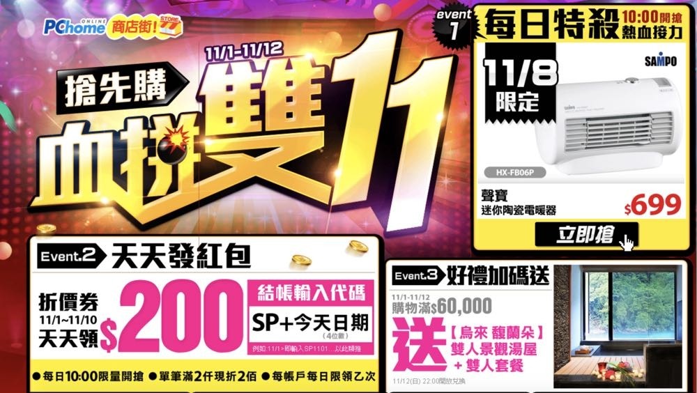 。天天推出破盤價商品、祭出全年最低價,雙 11 之後還有多項抽獎活動及限定驚喜優惠,一直延續至11月30日。