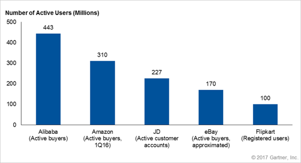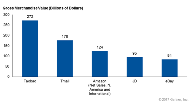 首先看到的是 Gartner 列出了全球前五大電商,分別為 Taobao (淘寶)、Tmall (天貓)、Amazon 、JD (京東) 與 eBay,在 2016 年的 GMV (網站成交金額),GMV 指的是消費者在網上購買商品,最後按下「立即購買」後的累計金額,雖然說不包括後續退貨的金額,但這也是許多電商用來參考能否吸引足夠的買家前往平台購物的依據,更是 1111 這電商大節日用來衡量(宣示?!)表現的方式!