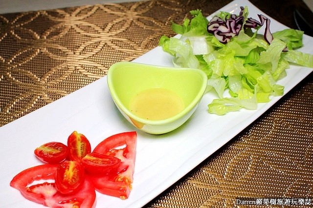 前菜的生菜沙拉搭配醬料爽脆好吃,醬料的調和很不錯跟蕃茄很搭我一直沾到醬不夠還跟服務生要