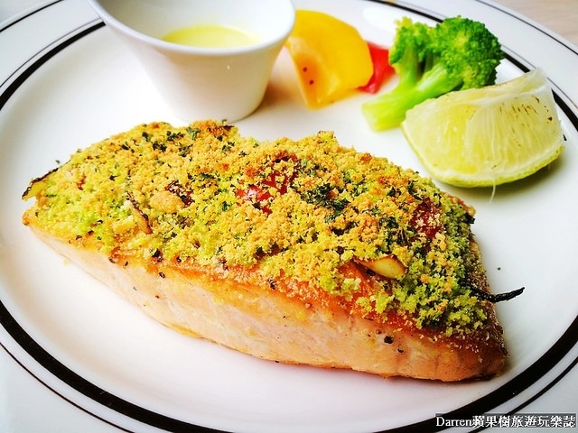 超級厚的鮭魚排上面是用起司、蕃茄洋蔥和麵包粉等香料烤到外面口感酥香裡頭魚肉本身甘甜多汁