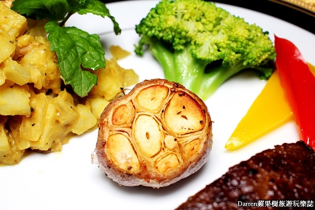 旁邊的烤大蒜用叉子就能挑起來充滿蒜香綿密又不會有辛辣的滋味單吃或者搭配牛排一起入口都不錯