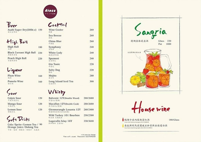 Aiueo餐廳裡面有紅白酒、啤酒、調酒等,這裡有專業的服務人員會來介紹酒,就算第一次來也能輕鬆點餐酒