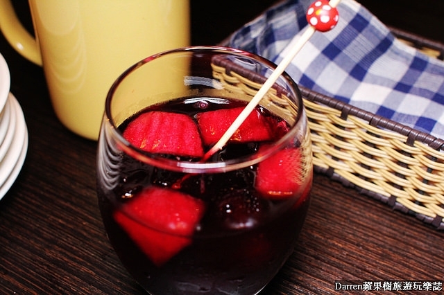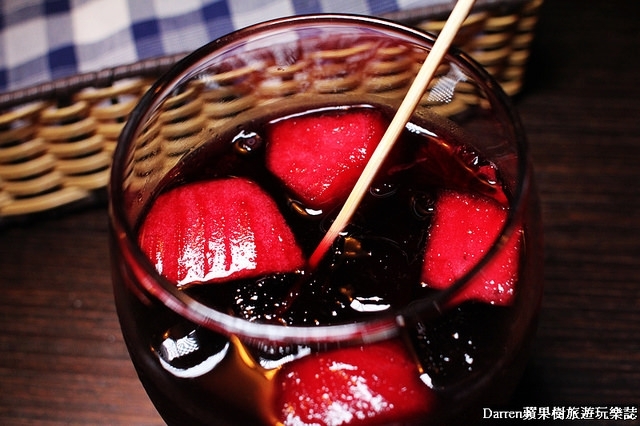 特調桑格利亞酒Sangria是使用紅酒、水果切片、糖漿、蘇打水調製,酸甜不澀酒味不重果香誘人好喝