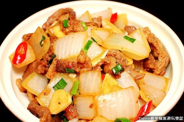 有點類似中式的快炒使用了美國牛小排的牛筋膜下去川燙過,再加入了醬油、洋蔥、大蒜和辣椒等下去拌炒