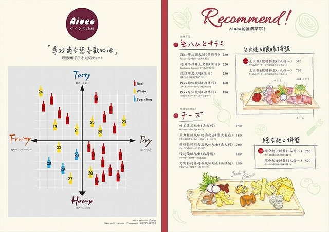 ▲Aiueo酒場菜單MENU,酒單設計有手繪風格很促咪,餐廳提供很多種類的紅白酒,酒品名都有加註編號
