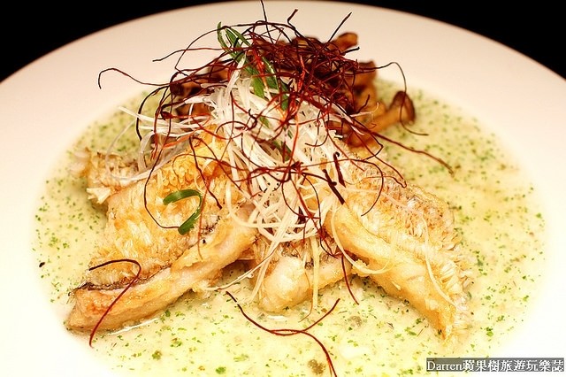 下方的醬汁是用菠菜泥和蛤蜊熬製的醬汁,旁邊還有柳松菇還有魚肉可以一起搭配增加脆度