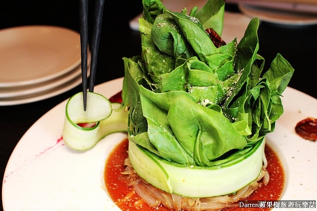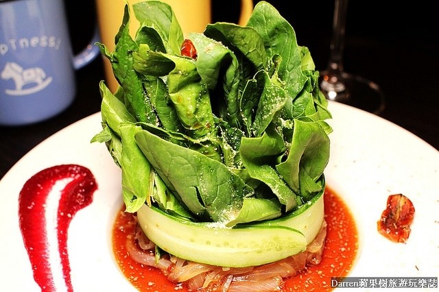 吃法就要像拆禮物先把黃瓜緞帶拆開來,然後生菠菜、洋蔥加上風乾蕃茄,用小黃瓜捲起來沾點甜菜根醬和油醋醬享用
