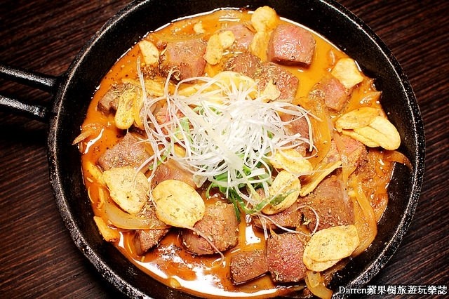 使用美國牛肉切塊成骰子狀,加入醬汁下去拌炒在牛肉是五分熟度,夾起骰子牛肉入口微彈又嫩口