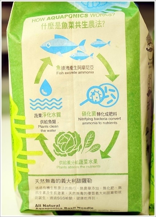 ▼包裝側邊還有介紹「魚菜共生」農法,所謂魚菜共生農法也就是魚提供養分給菜,菜幫魚過濾水質,如果有添加農藥化肥或成長激素的話這兩種生物與植物一定馬上就會發現,在歐美等先進國家來說是最安全的有機生態農法;採用這種農法所生產出來的義大利甜羅勒自然也是無農藥添加、無化肥、無抗生素與生長激素的安心農作物,並通過SGS檢驗合格,享用起來也能更加安心!