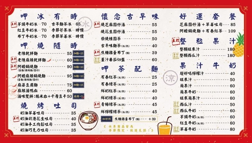▼菜單,裡頭有冰品、熱食、吐司、古早味、茶品、套餐、整粒果汁與果汁牛奶,選擇還不少,想要呷冰呷熱、吃飽吃巧都沒問題!