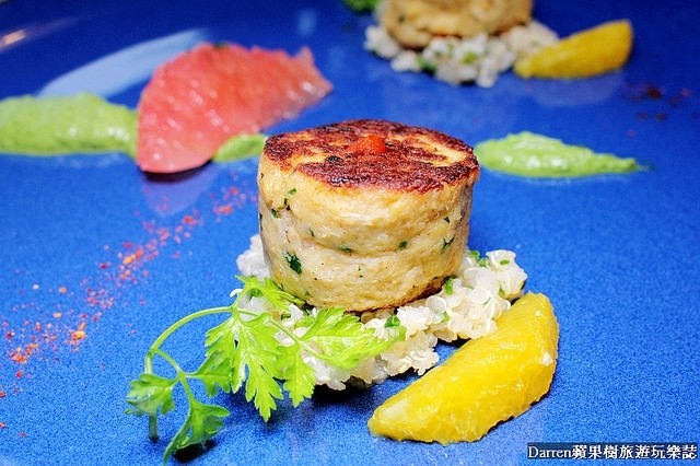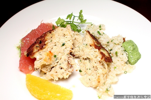 這道料理把傳統蟹餅加重乾蔥風味和橙片、葡萄柚片等醬汁,再加入黎麥最後搭配用香菜打製的青醬