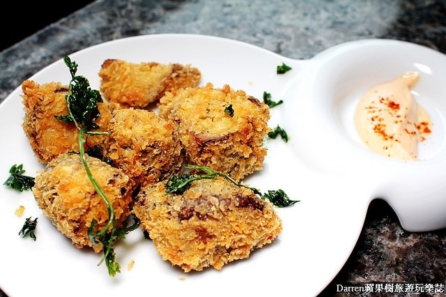 在拍攝這道料理從上面往下看又有點像孔方兄古代的貨幣,入口脆皮的脆感有如餅乾酥脆不會太乾硬