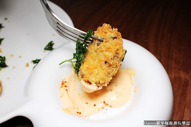 蟹餅上頭放置一匙源於加州風靡全球的是拉差香甜辣椒醬,看似簡單的蟹餅其實是一道充滿層次的料理