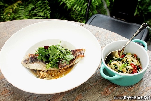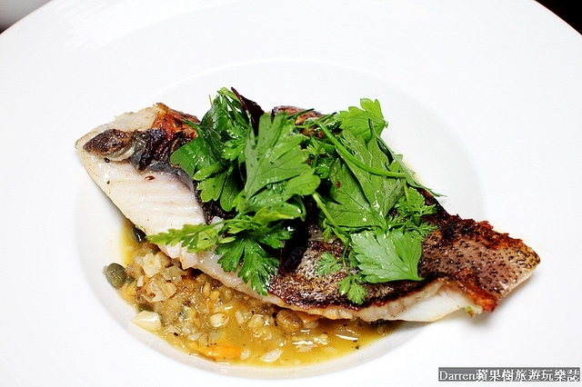 近期更把兩者育種而成魚種的龍虎斑,這裡使用的虎斑魚,單面煎再放入烤箱烘烤吃起來口感綿細