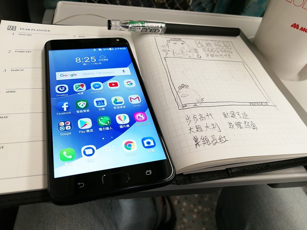ZenFone 4 Max 的電池容量有 5,000mAh,這幾乎是我另外一支手機的兩倍,厲害的是還做得這麼輕薄啊!根據我一次帶出門工作的經驗,用兩天根本也綽綽有餘,我還時不時一邊記錄插畫腳本、一邊查資料,用到第二天居然還有 50% 的電量!