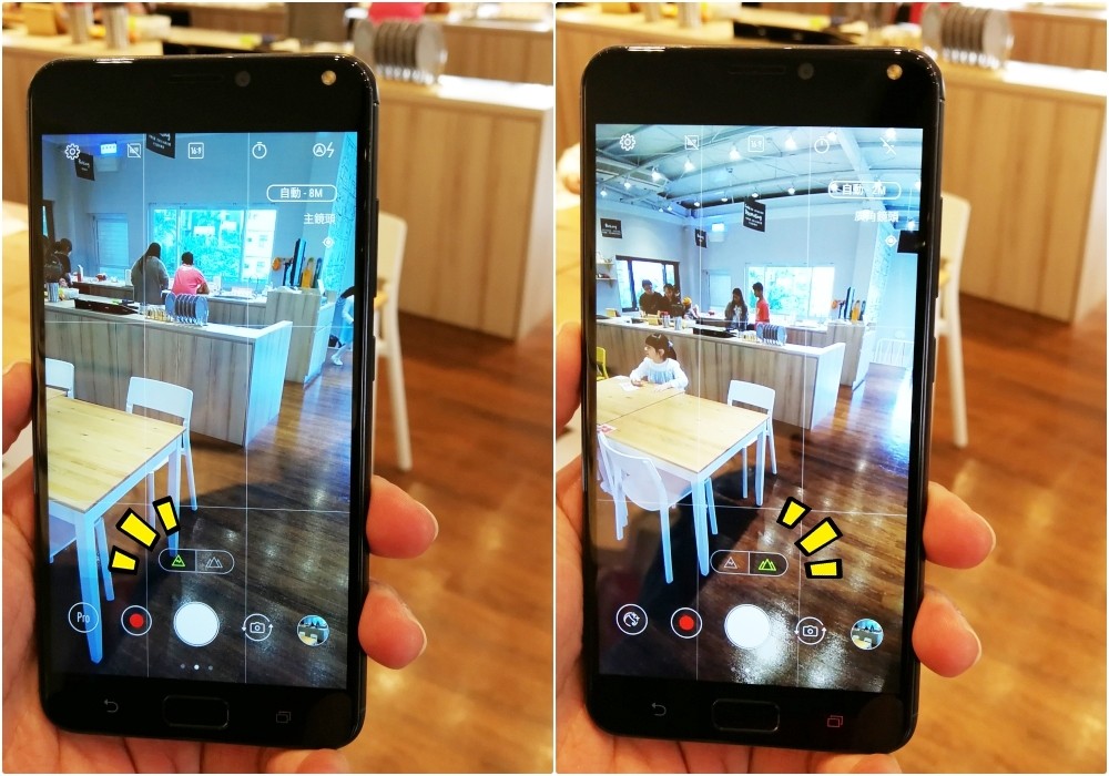 這裡採用「一鍵式切換鏡頭」,直拍時下方有個「小山丘」的圖示,想要拍廣角就點右邊那個「有很多座山」的 icon,就能拍出比一般傳統智慧型手機大 200% 的廣視角。