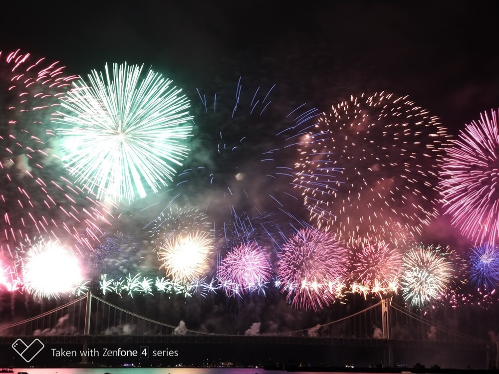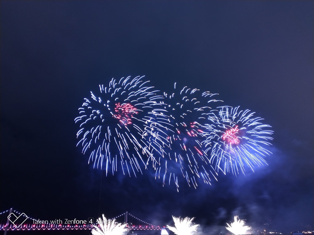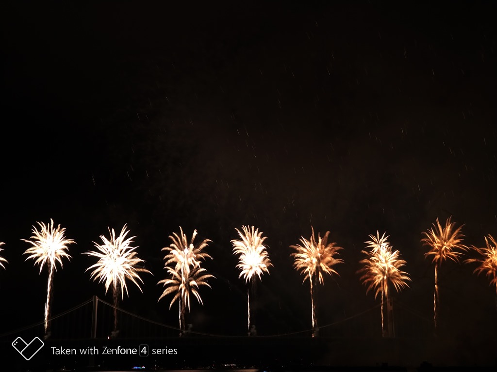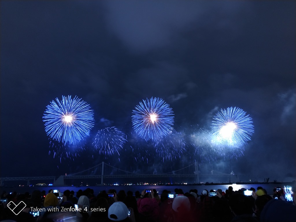 煙火真的可以用 ZenFone 4 Pro 拍下來嗎?這真的是好問題,因為還沒拍之前我也沒把握。這次參加釜山煙火節,是在官方規畫的付費觀眾席上,雖然在聲光效果上是最棒的地點,但對於拍攝並不是,因為這邊只能乖乖地坐在選定的位置上,所以腳架也無法架太高,不然會擋到後面的觀眾,但太低又會拍到前面的人頭,以下就先分享幾張沒有經過任何調整的煙火照給大家,使用 0.5~2 秒左右的曝光時間主要目的是控制煙火不會糊成一片的狀況下,有更完整的畫面可以呈現給大家。