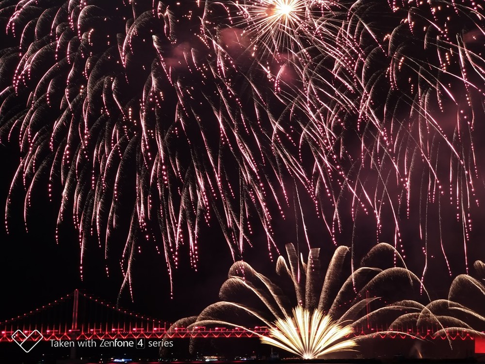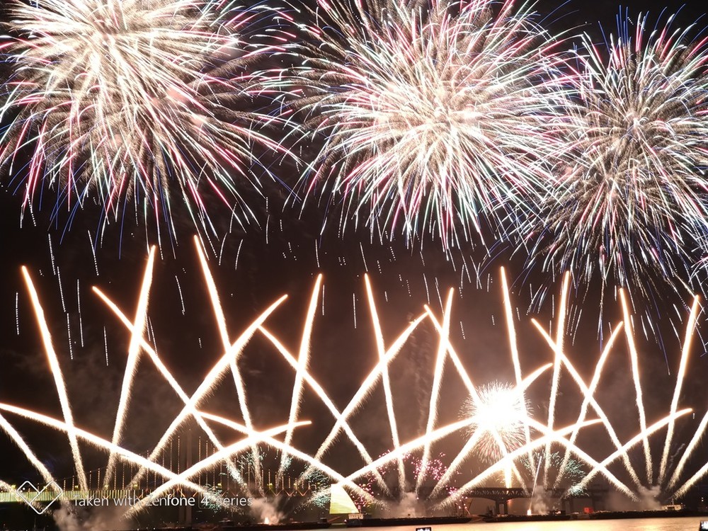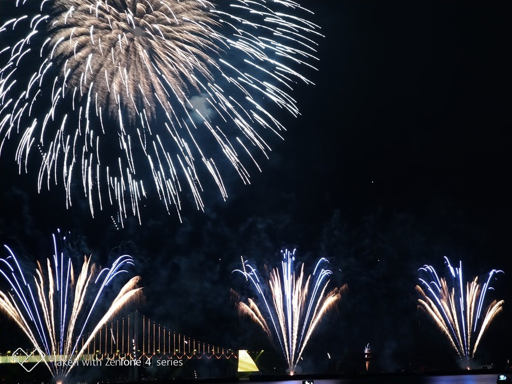 上面這幾張都是使用望遠端拍攝,還好有望遠鏡頭的幫助,才能讓照片在不裁切下完整呈現,當然如果要把範圍廣闊的煙火施放場地全部拍下,就一定得依賴取景較為廣闊的主鏡頭來協助,以下分享幾張沒有經過裁切與任何後製,以主鏡頭拍下的煙火。