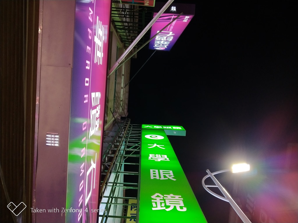 路邊招牌:抬頭仰望招牌這角度拍照很有意思,隨手拿起一拍,發現 iPhone X 一樣在強光抑制上並沒有控制得太好,但 ZenFone 4 Pro 就有很清楚的成像,非常厲害。