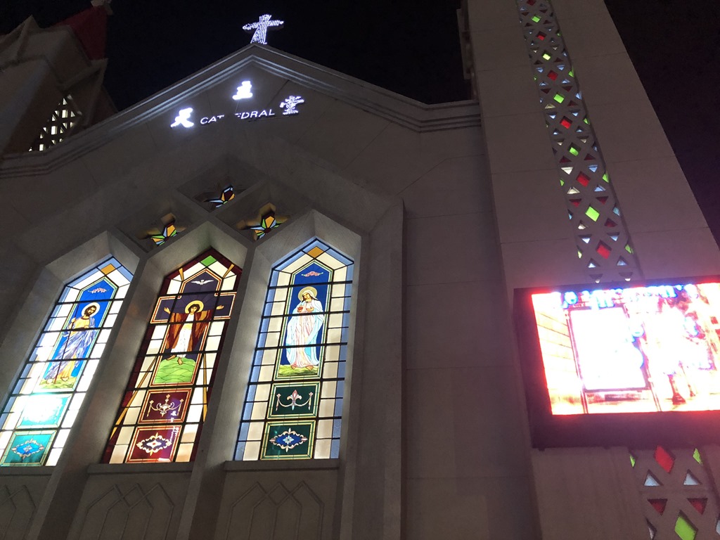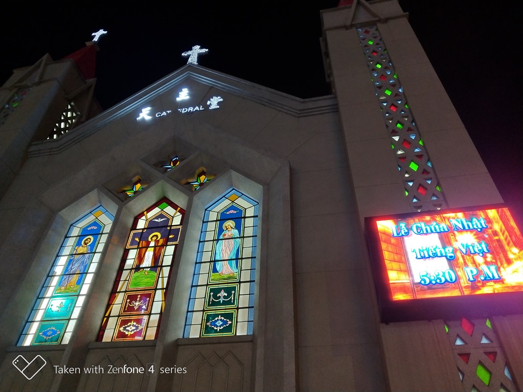 教堂場景:教堂前的 LED 看板其實亮度非常高,有時連路過都會被閃到無法直視。拍攝後發現,兩張照片整理亮度不會差異太大,但很明顯發現 iPhone X 所拍下的 LED 看板是過曝的,ZenFone 4 Pro 卻可以看清楚畫面中的細節。