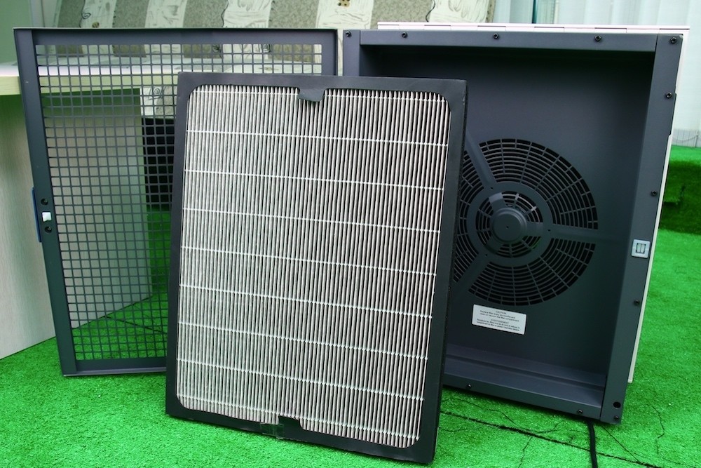 打開機身背面的外蓋,取下的是 Classic 280i 的 SmokeStop 複合式活性碳濾網,從進風口與濾網面積、厚度可以看出,這組濾網的集塵效果以及過濾品質表現相當出色。這組濾網是由白色的 Particle 微粒濾網,以及置入了高達 0.8 公斤 (此系列最高含 1.8 公斤活性碳顆粒) 活性碳的黑色 SmokeStop 活性碳濾網組合而成,搭配封閉式負離子充電室,使 Classic 280i 與 Blueair 空氣清淨機的淨化效果超越其他採用單一機械式或靜電技術的清淨機,可有效過濾空氣中的有害物質,像是 PM2.5、甲醛、甲苯、細菌、黴菌、塵蟎、油煙…等物質,提供用戶清新的空氣品質。必須注意的是,Blueair 必須定期更換新的濾網,千萬不可以使用清水、噴槍…等方式清潔濾網,以免機器內孳生黴菌,造成機器操作聲音變大或故障的風險。