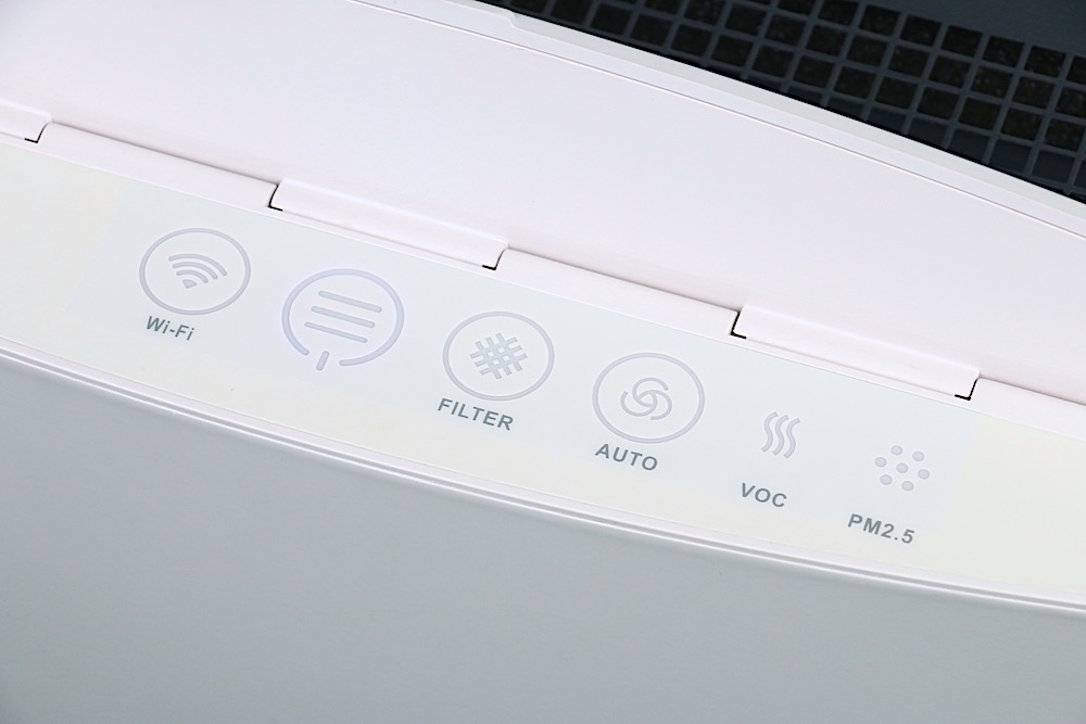 而在機身頂部,有個隱藏式磁吸面板,將蓋子掀開後可以看到 Classic 280i 的所有控制按鍵與燈號,由左到右分別是 WiFi 配對按鍵/燈號、風力大小、濾網使用狀態燈、自動風速、VOC (揮發性有機化合物) 指示燈,以及 PM2.5 指示燈 (藍燈表示空氣良好,橘燈表示空氣污染)。