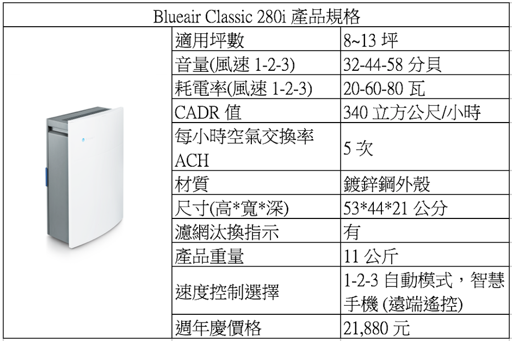 以下是 Blueair Classic 280i 的詳細規格表,提供給大家參考。
