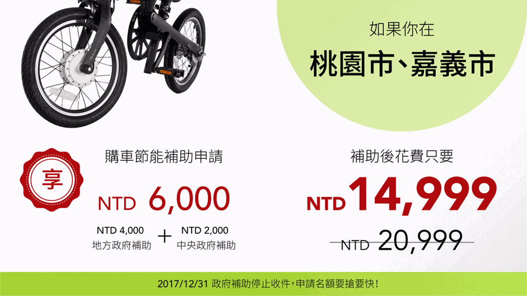 買自行車還能申請節能補助?你沒聽錯,今年加入台灣單車市場的騎記單車,他們所推出的 QiCYCLE 騎記電助力摺疊自行車 符合政府推廣新購電動二輪車補助辦法,地方政府補助加上中央政府補助後,最高合計可省下 8000 元,補助方案將於今年年底截止,要買要快。