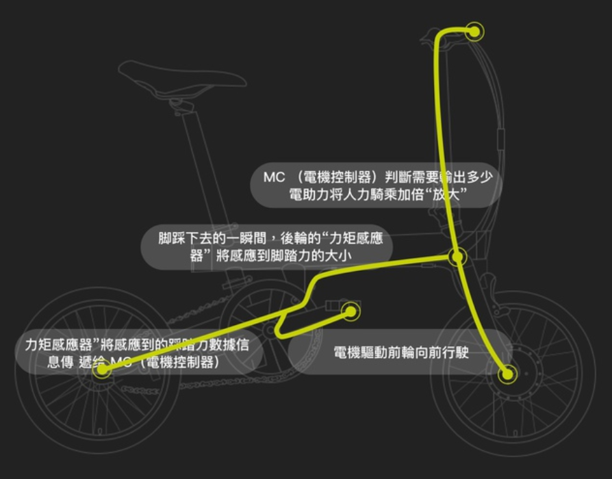 而 QiCYCLE 騎記電助力折疊自行車 採用 TMM 力矩傳感技術,自動感應雙腳踩踏力量大小,並輸出適當的電助力輔助騎行,就像是踩踏的力量被放大一般,騎乘的舒適度更好,無論是通勤或是輕旅行都更輕鬆。
