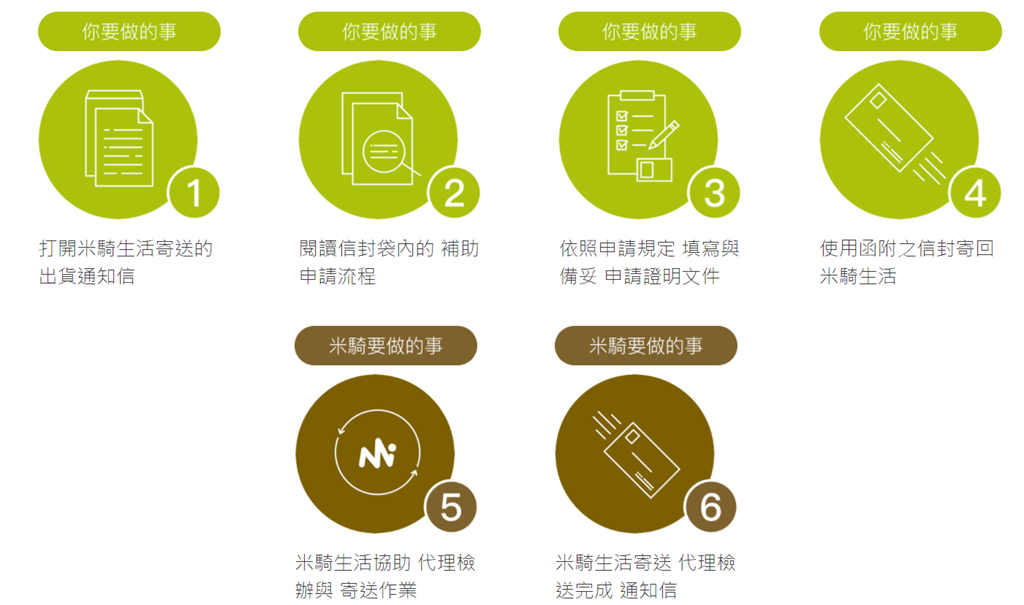 申請電動二輪車補助會很麻煩嗎?騎記特別整理申請補助要做的事,其實非常簡單,你只要打開米騎生活的出貨通知信與填妥備妥申請證明文件,並使用裡面附的信封將資料寄回米騎生活,接下來米騎生活就會協助你完成後續工作,非常簡單。