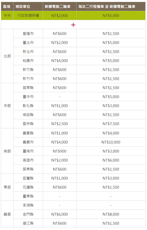 米騎生活也整理出購電助車可申請環保署補助與縣市政府加碼補助,大家可以參考以下表格: