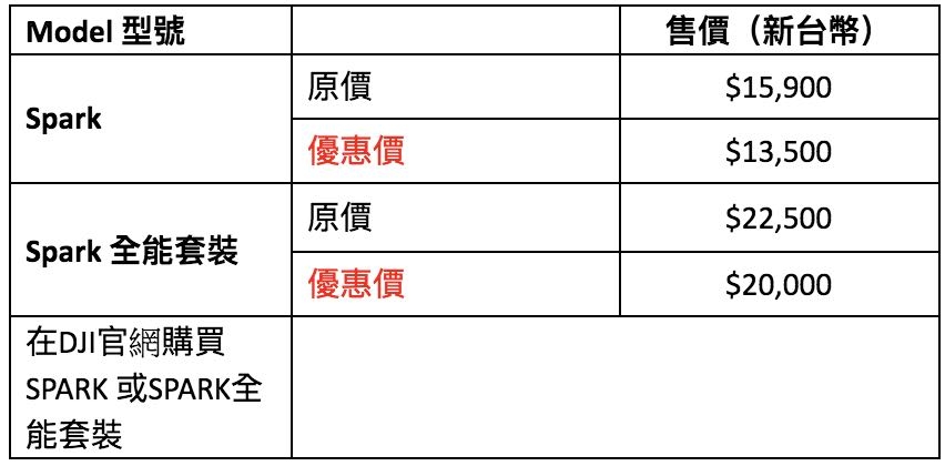 DJI 表示對於想捕捉靈感瞬間並隨時分享航拍影像的用戶,購買 Spark 可享高達 8.5 折的價格優惠; 想深度體驗 Mavic Pro 的用戶購買全能套裝可享 NT$2,500 的折扣; 單獨購買 Phantom 4 Advanced 或 Phantom 4 Pro 能獲贈一塊免費備用智能飛行電池;對於想拍出專業級高品質影片,或想享受第一人稱視角 (FPV) 飛行體驗的消費者,OSMO 系列或者 DJI Goggles 也是不錯的選擇。