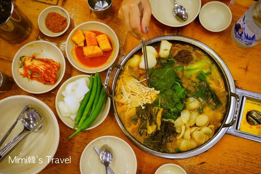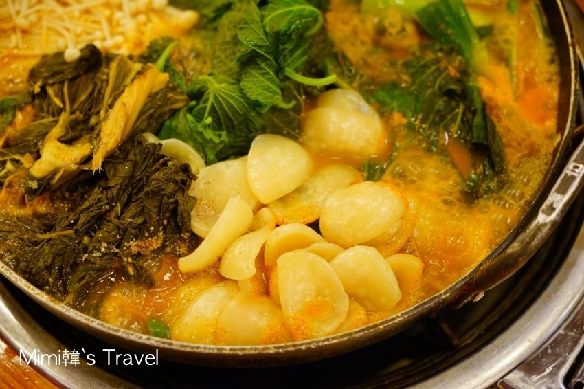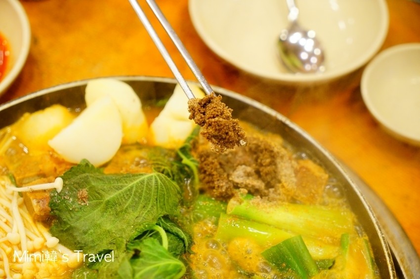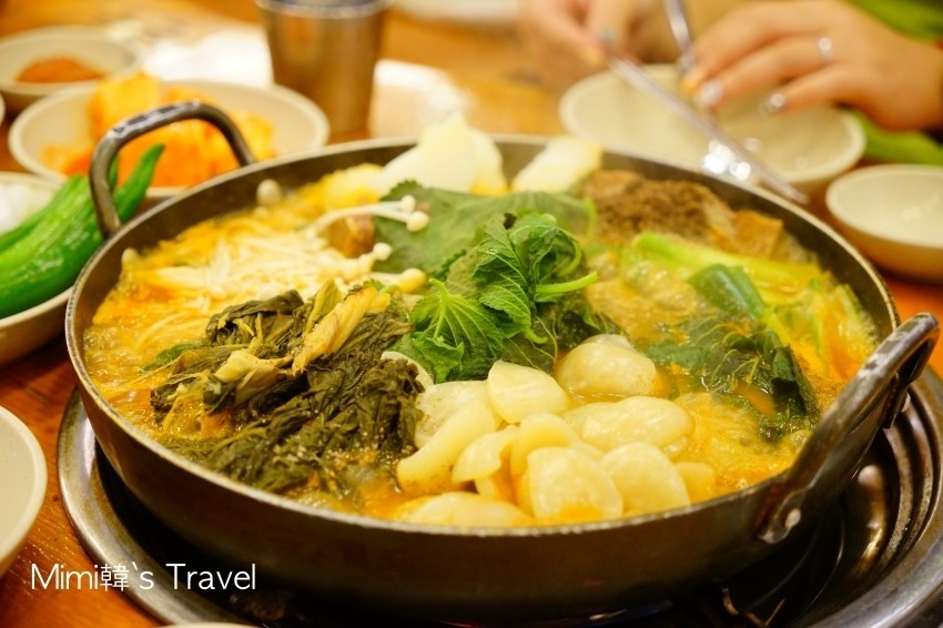 我們點了中份的豬骨湯($33,000韓元),裡面的料就很多很多,底層有好多燉到軟嫩的排骨,還有馬鈴薯、麵疙瘩、金針菇、芝麻葉等,光這鍋我們兩個就差點吃不完,如果食量大的話,可以再點像是年糕、冬粉等食材加進去,或是最後像雜炊一樣做成炒飯都很棒。